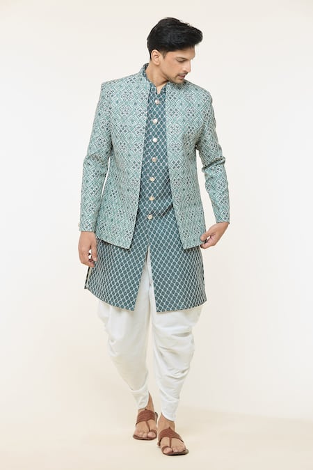 Green full sleeve jacket featuring geometric print and mandarin collar. Paired with a sleeveless bundi and white peshawari pant.