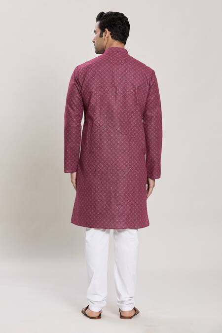 Wine kurta featuring a geometric print with a band collar and long sleeves. Paired with a pure cotton churidar for a complete look.