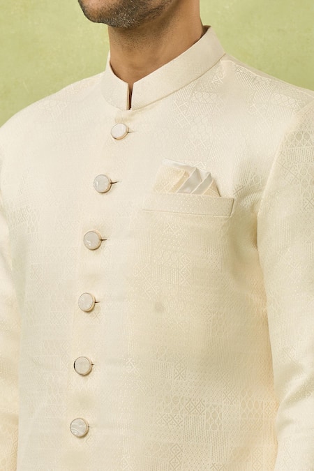 Cream sherwani featuring a geometric woven pattern and statement buttons. Paired with a white polo pant for a complete look.