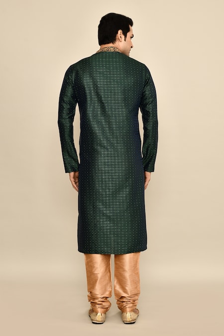 Green kurta featuring geometric woven motifs with zari thread and sequin embroidered placket. Paired with chikoo churidar in art silk fabric.