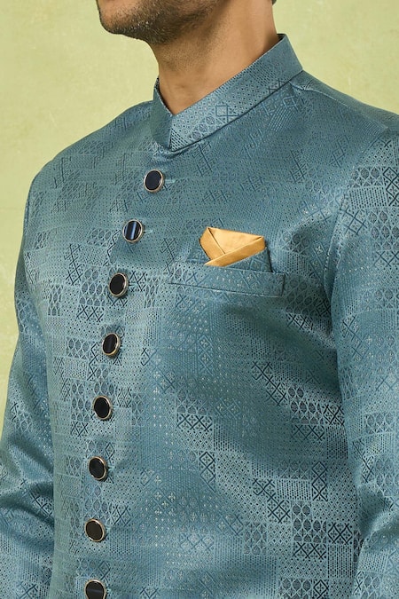 Statement buttons on the sherwani, Geometric woven design, Band collar neckline