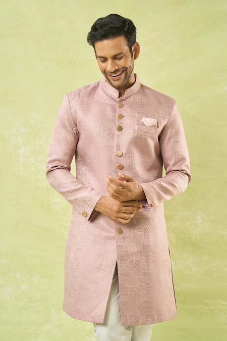 Pink sherwani featuring a geometric woven pattern with a band collar and long sleeves. Paired with a white polo pant for a complete look.