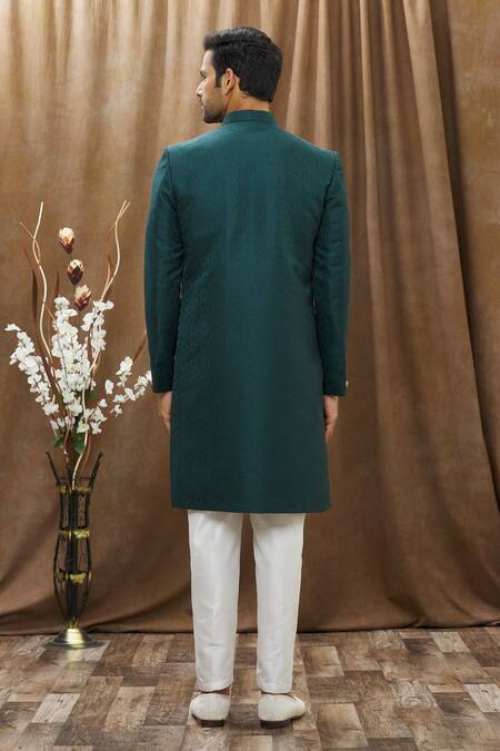 Bottle green sherwani featuring geometric woven motifs and a mandarin collar. Paired with solid white pant for a complete look.