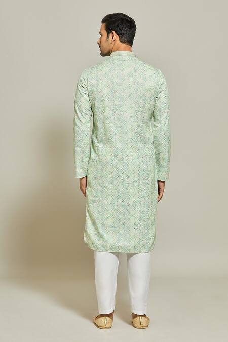 Pista green kurta featuring geometric print and thread embroidery. Paired with off white aligadi pant.