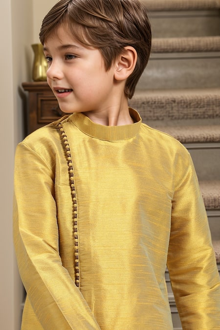Gold angarkha kurta featuring full sleeves and asymmetric placket. Paired with a matching pant for a complete look.