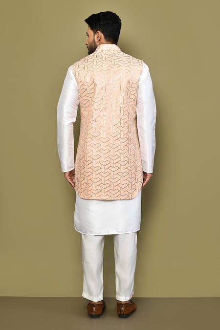 Peach bundi featuring geometric gota and thread embroidery. Paired with a white full sleeve kurta and pant.