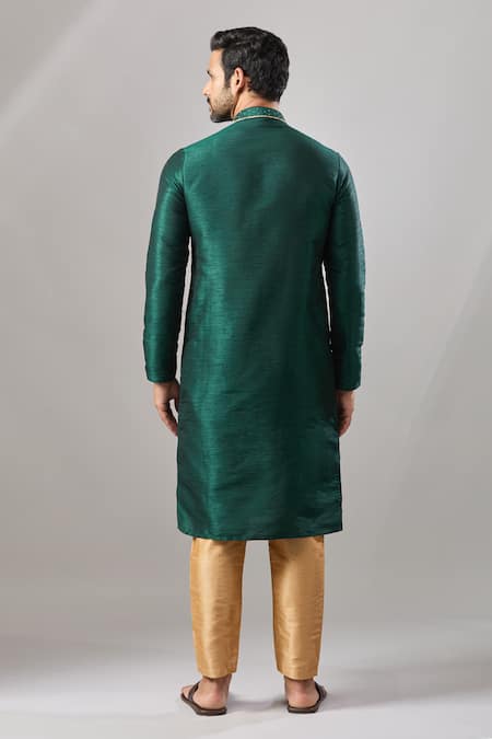 Green kurta made from plain Banarasi art silk featuring intricate embroidery on the neckline