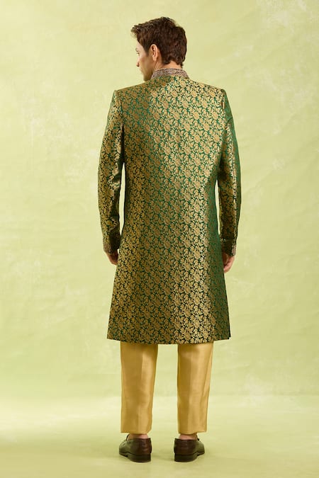 Green sherwani made from jacquard Banarasi silk featuring intricate work on the chest and neck with button detailing. Paired with gold half elastic pants in dupion art silk.