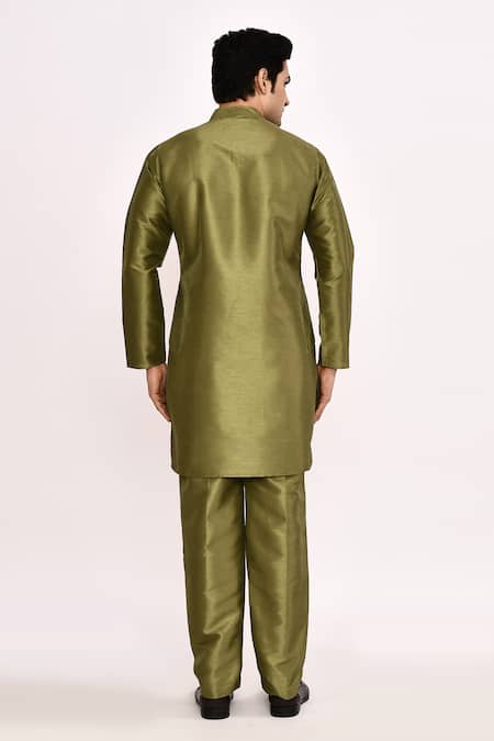 Green silk blend kurta featuring a straight cut and a mandarin collar. Paired with matching silk blend pants.