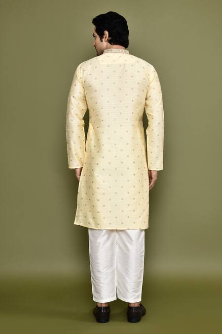 Cream kurta featuring full sleeves, mandarin collar, and embroidered placket with gul jaal pattern. Paired with off-white pant for a coordinated look.