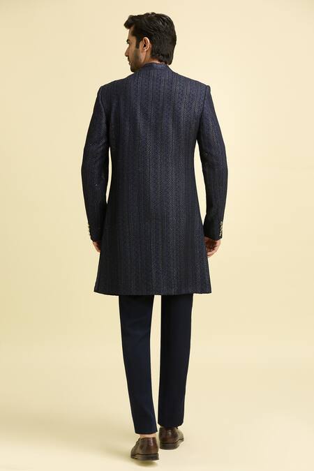 Blue bandhgala featuring full sleeves and band collar with all over Gullista striped vine embroidery. Paired with a matching trouser for a complete look.