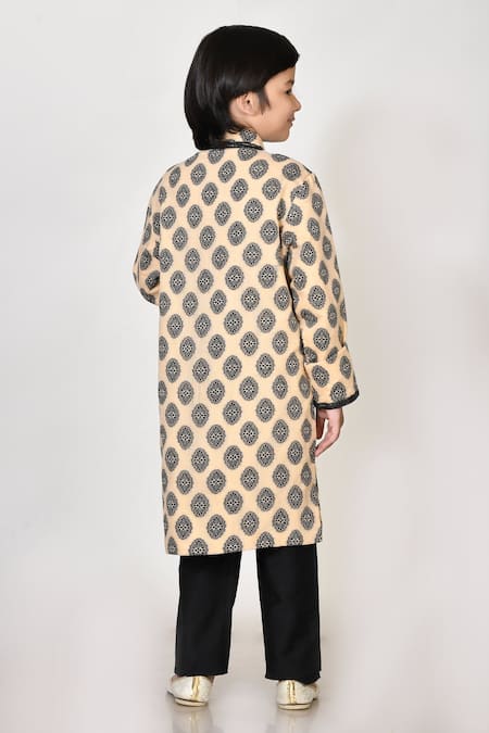 Beige kurta featuring black woven motifs, lace trims, and button front closure. Paired with black straight pants and designed with side slits and a semi-elasticated waistband.