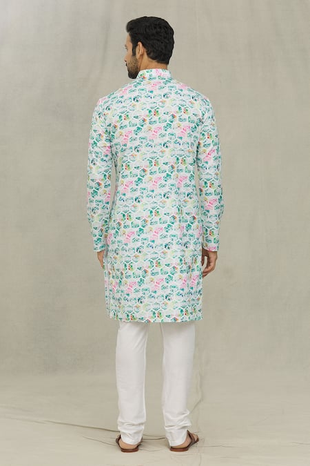 White kurta featuring a hexagon print, full sleeves, and a mandarin collar. Paired with a matching churidar featuring a drawstring closure.
