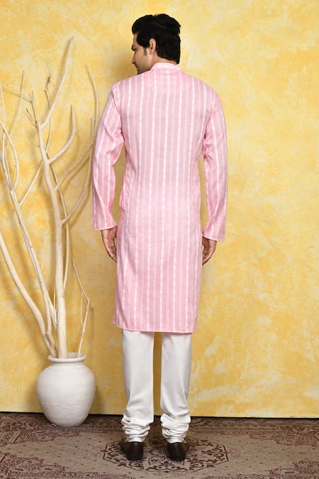 Pink kurta featuring hexagon stripe print, full sleeves, and mandarin collar. Paired with a white churidar with an elasticated waistband.