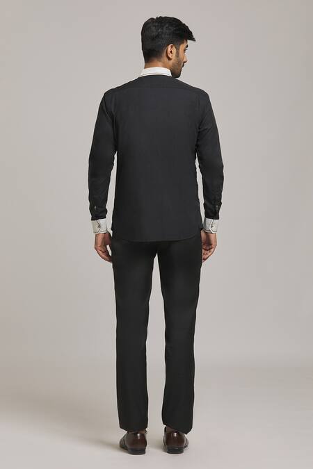 Black shirt featuring inverted pleats, a shirt collar, and long sleeves