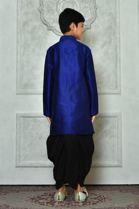 Royal blue kurta featuring full sleeves and a mandarin neckline with front buttons. Paired with a black dhoti pant for a traditional look.