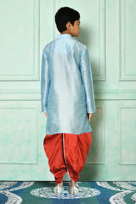 Sky blue kurta featuring full sleeves and front buttons. Paired with a red dhoti pant.