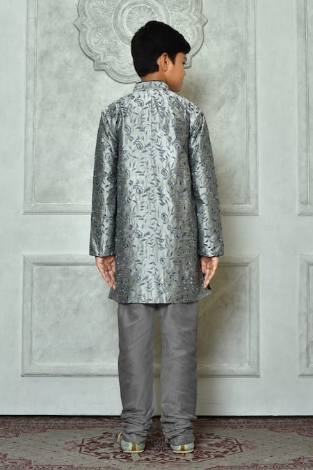 Grey kurta featuring paisley and leaf thread work with a mandarin collar. Paired with a matching churidar for a complete look.