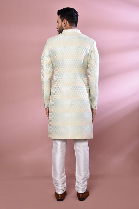 Off white nawabi kurta featuring a multi sky colored woven leaves pattern and a mandarin neckline. Paired with a white churidar in a silk blend fabric.