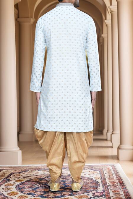 Powder blue kurta featuring a woven leaf petal motif throughout. Paired with a beige patiala pant featuring an elastic waistband.