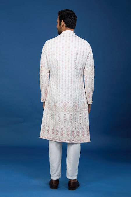 Off white base silk blend sherwani featuring gold and pink thread embroidery. Paired with white poly viscose Peshwari pants.