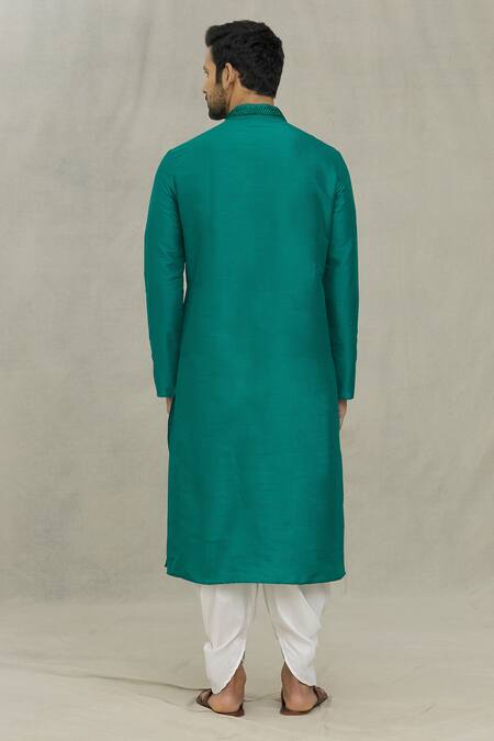 Rama green art silk kurta featuring full sleeves, mandarin collar, and dual toned thread embroidery on the yoke. Paired with a contrasting white pleated cowl draped dhoti pant with an elasticated waistband.