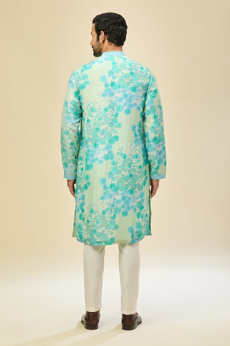 Light blue kurta featuring a digital print design. Paired with off white cotton polo pant.