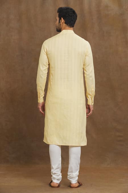 Gold kurta featuring a mandarin collar and full sleeves with a linear print