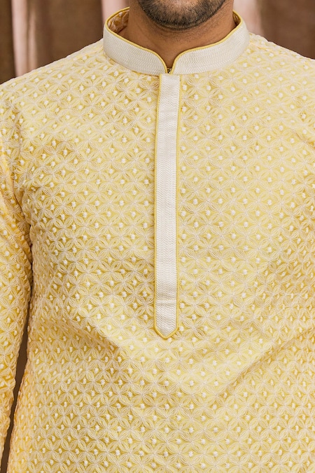 Yellow kurta featuring Lucknowi embroidery and a thread work placket. Paired with a churidar for a complete look.
