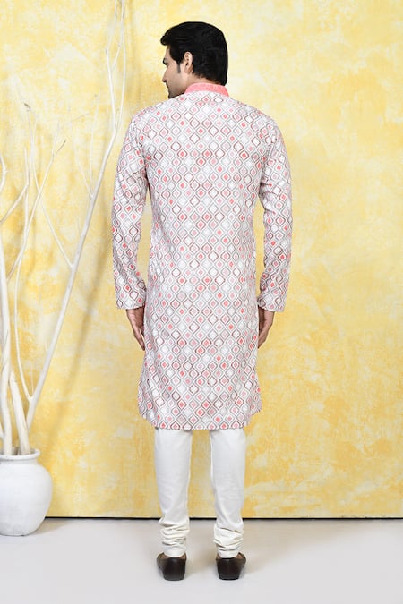 Peachish orange kurta featuring full sleeves and mahal jaal print detailing. Paired with a white churidar made from cotton blend fabric.