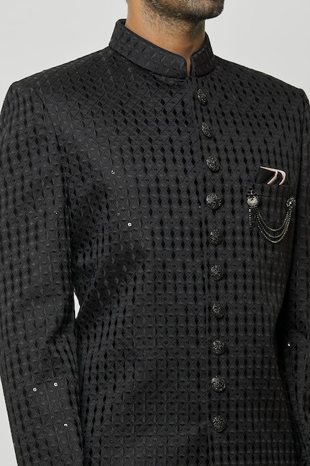 Black sherwani featuring sequins and thread embroidery with a mandarin collar. Paired with dupion art silk pant for a complete look.