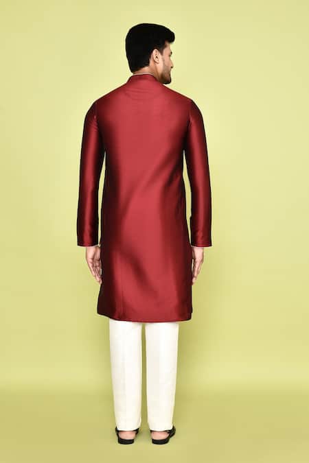 Maroon Silk, Cotton Mandarin Collar Kurta With Pant