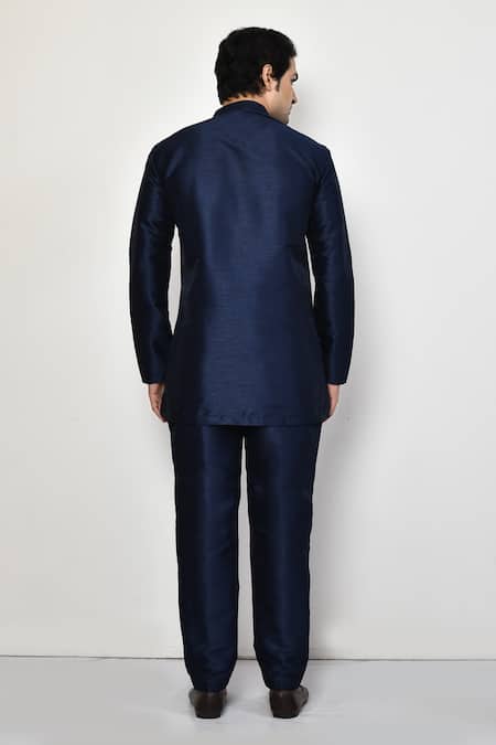 Navy blue silk blend kurta featuring a mandarin collar and full sleeves