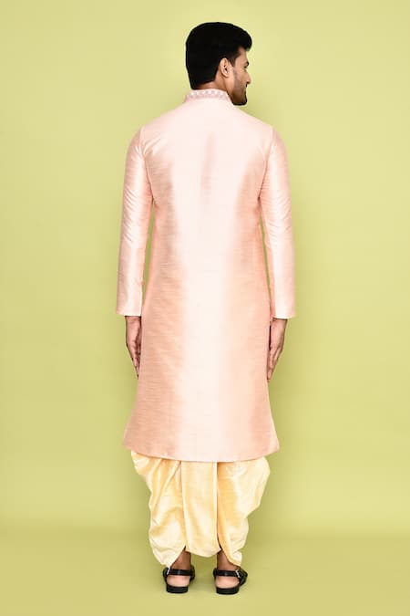 Pink kurta featuring thread and mirror embroidery with a band collar. Paired with a cream dhoti pant for a complete look.