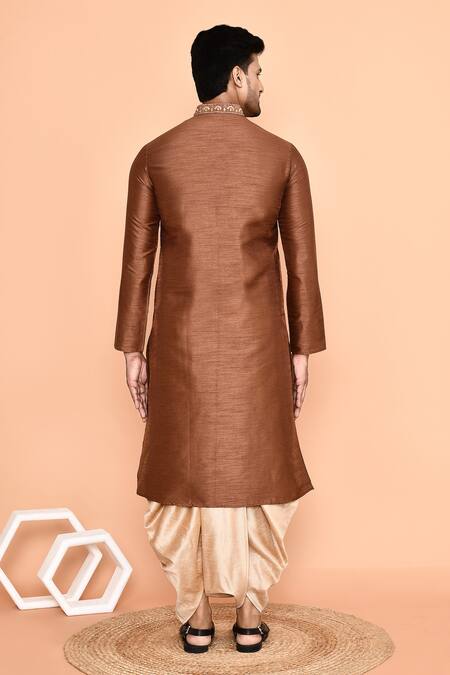 Brown kurta featuring mirror and thread embroidery with a band collar. Paired with a cream dhoti pant for a complete look.
