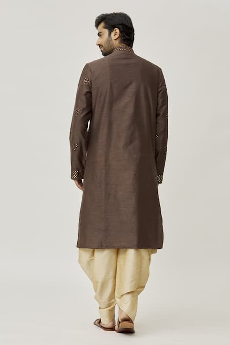 Brown kurta featuring mirror and thread embroidery with a mandarin collar. Paired with a dark beige dupion silk dhoti pant.