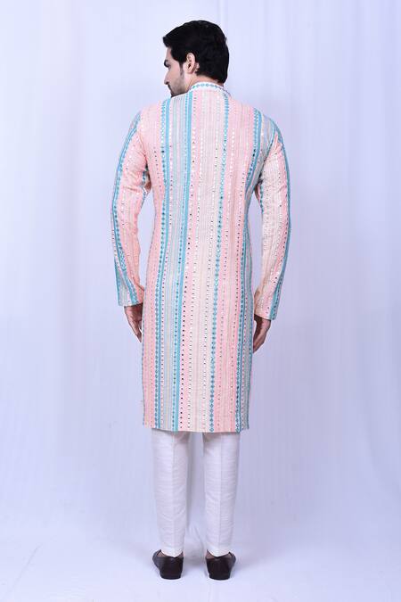 Multi color kurta featuring full sleeves, a mandarin collar, and all-over stripe mirror embroidery. Paired with a white art silk pant.