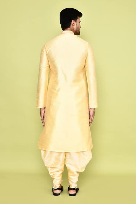 Yellow kurta featuring mirror and thread embroidery on the neck and placket. Paired with a matching patiyala for a complete look.