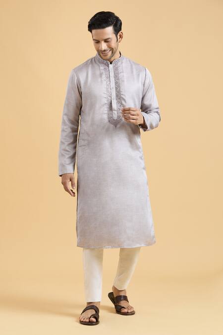 Lilac kurta featuring geometric mirror embroidery on the placket