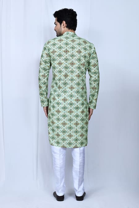 Pastel green kurta featuring an all-over Moroccan print, mandarin collar, and full sleeves. Paired with straight-fit white art silk pants that include side pockets.