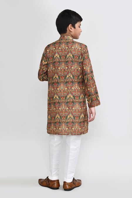 Multicolour kurta featuring a printed design made from cotton fabric. Paired with white art silk pants that have a relaxed fit.
