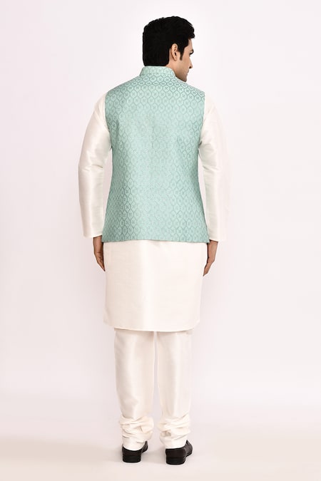 White silk blend kurta paired with matching churidar. Complemented by a blue silk blend Nehru jacket featuring a textured design.