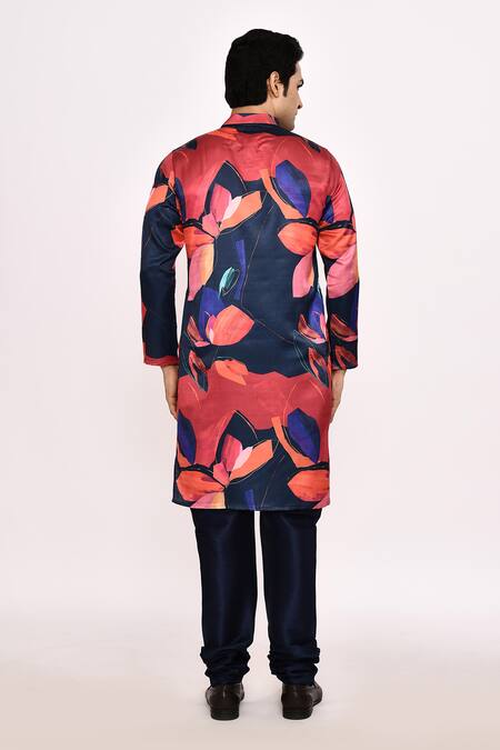 Multi-colored kurta featuring a vibrant floral print with a button placket. Paired with blue silk bottoms for a complete look.