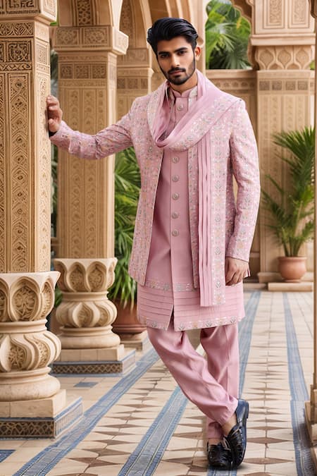 Pink Silk, Satin Cut Work, Sequins, Beads Onion Embroidered Jacket Sherwani Set