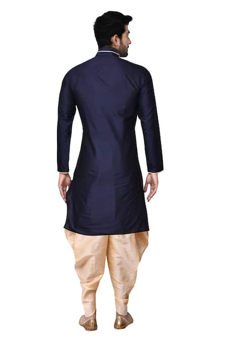 Blue overlap kurta featuring an embroidered panel, patch pocket, and asymmetric button placket. Paired with a dhoti pant for a complete look.