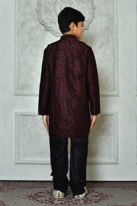 Wine kurta featuring leaf and paisley thread work with a mandarin collar. Paired with a black churidar for a complete look.