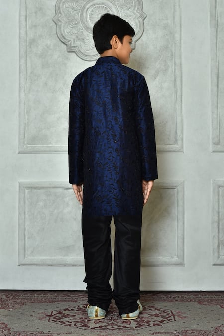 Navy blue kurta featuring leaf and paisley thread work with a mandarin collar. Paired with black churidar for a complete look.