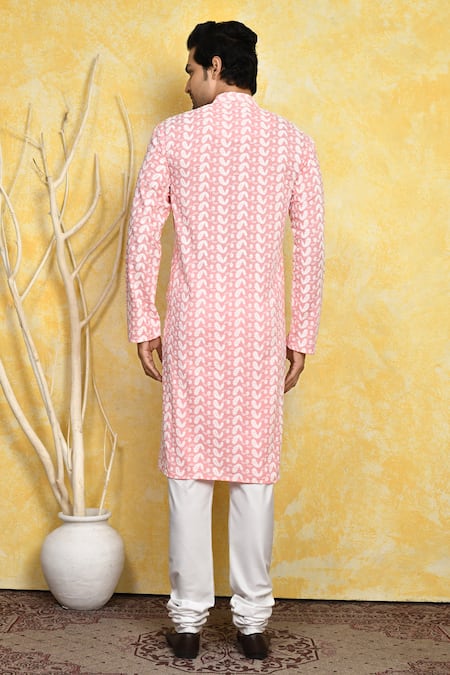 Pink kurta featuring full sleeves, mandarin collar, and resham paisley embroidery. Paired with a white churidar with an elasticated waistband.