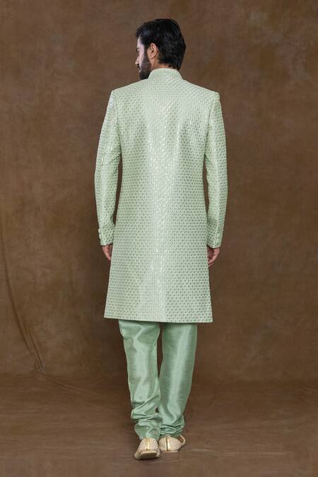 Pista green sherwani featuring sequin handwork with paisley pattern. Paired with a churidar and embellished hem dupatta.