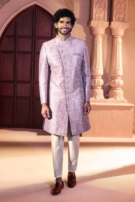 An onion pink art silk sherwani featuring intricate hand embroidered paisley patterns and an attached faux satin lining. It is paired with off-white dupion art silk pants.